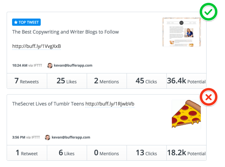 Now, when you’re scrolling through your Buffer history, you can see at-a-glance which posts have gone above and beyond your benchmark. You can recognize your best posts in a second or less!