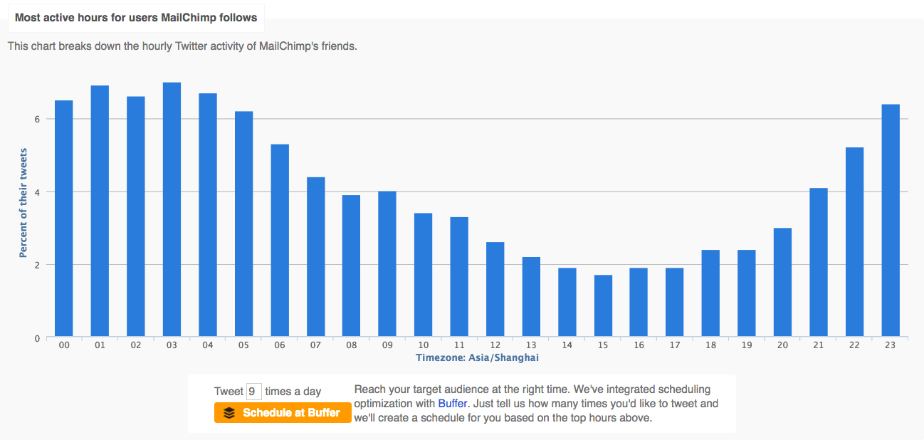 While Twitter Analytics does not provide similar followers’ activity data, Twitter tools like Followerwonk and Tweriod can tell you when your followers are most active.