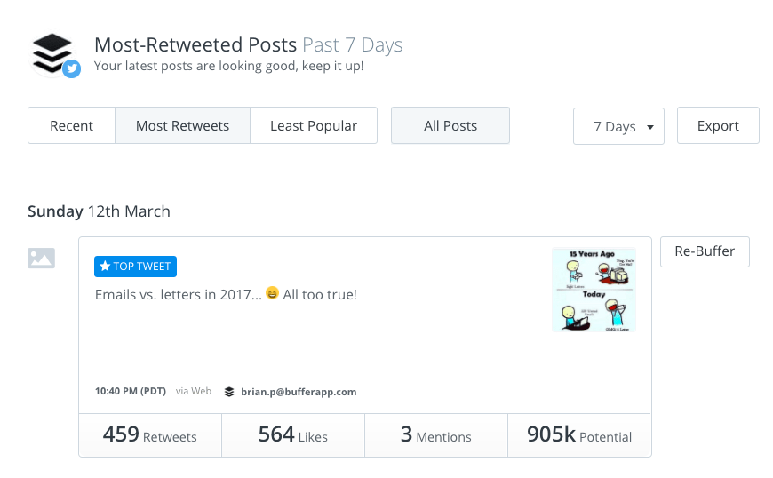 We’re hoping that one of the fastest ways to find your top-performing posts (across the networks) is in the Posts Report of your Buffer Analytics. At a glance, you can see the various types of engagement generated by each post. You can also sort them by a particular type of engagement such as retweets.