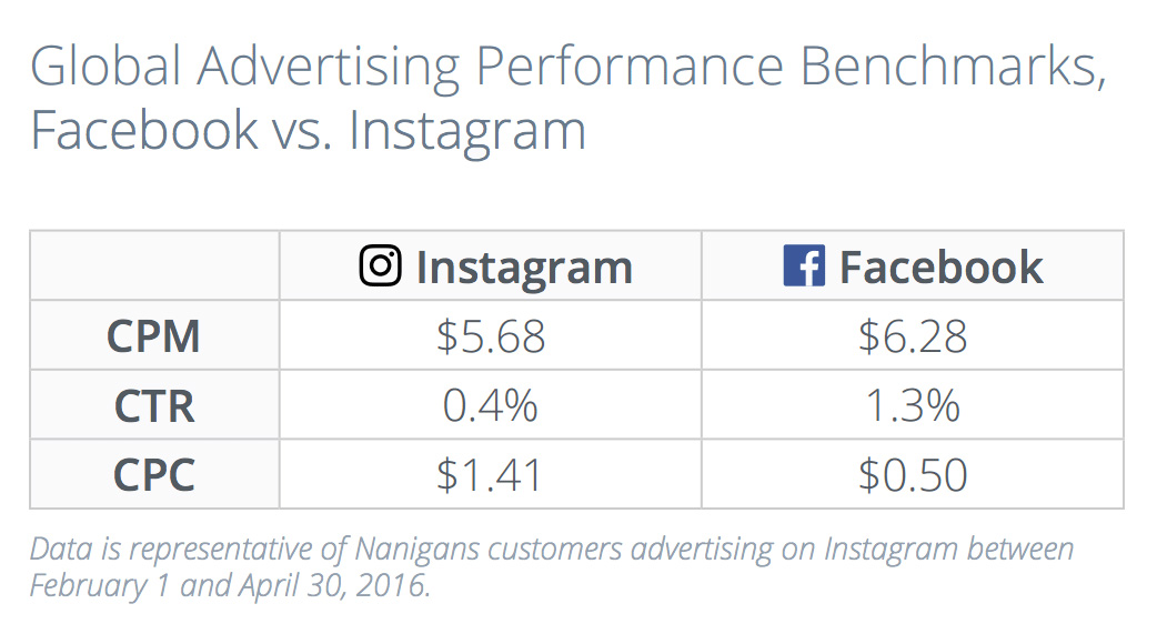 A study by Nanigans, a Facebook marketing partner, found that while Instagram ads cost less for impressions and clicks, Facebook ads have higher click-through rate.