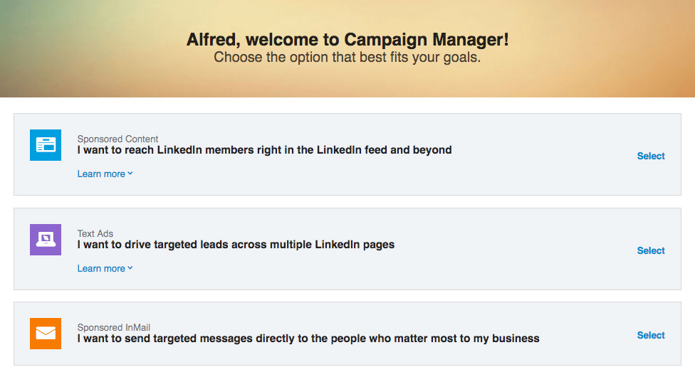 creating a text ad (which will appear on the top or the right side of many LinkedIn pages)